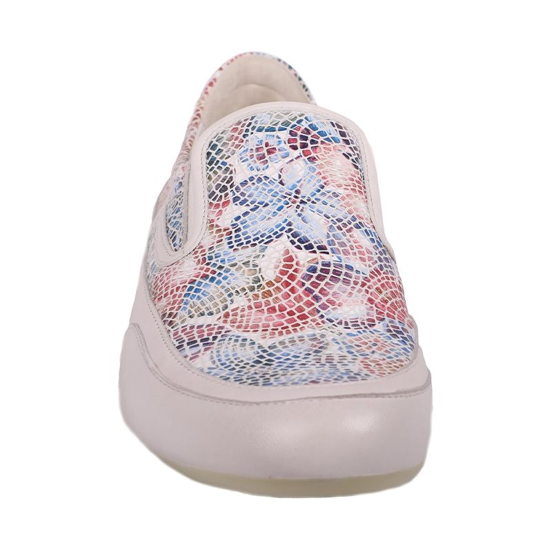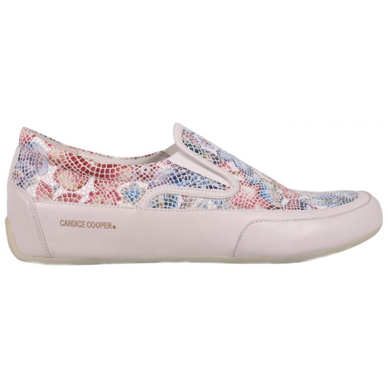 Candice Cooper Giulia to wsuwane buty damskie. Cholewka buta jest podzielona na dwie części. Dolna część buta wykonana jest z jasnej skóry, natomiast górna została stworzona ze skórzanej mozaiki układającej się w wyjątkowo designerski kwiecisty wzór. Podeszwa buta jest zrobiona z żółtej gumy a tuż nad podeszwą został wypalony napis z nazwą producenta. Za stabilność stopy odpowiedzialne są elastyczne pasy po obu stronach buta.
