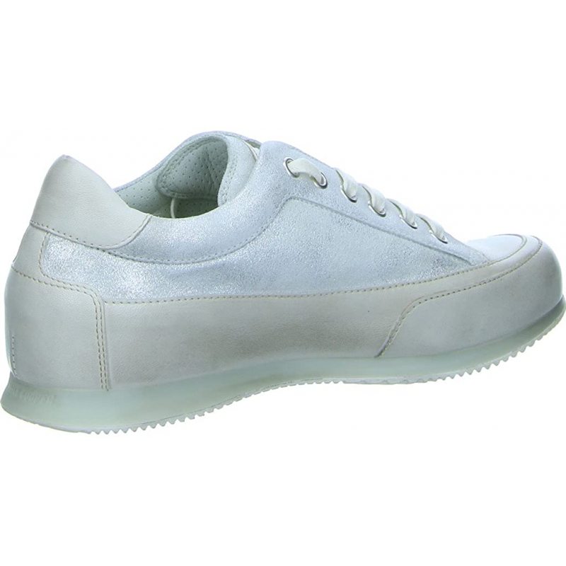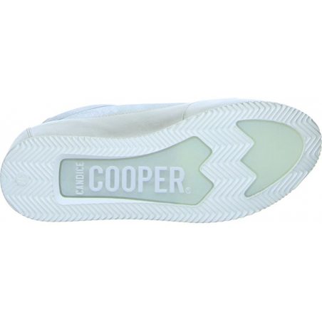 Candice Cooper Spot Bianco to damskie skórzane trampki. Cholewka buta jest podzielona na dwie części. Dolna część buta wykonana została z jasnej skóry podczas gdy górna wykonana została ze skóry koloru srebrnego. Podeszwa buta jest połączona z cholewką za pomocą przeźroczystej żółtej gumy, z której wykonane są też wstawki na podeszwie. Na języku buta znajduje się skórzana tabliczka z nazwą producenta oraz srebrny pasek przytrzymujący klasyczne płaskie sznurówki w białym kolorze.