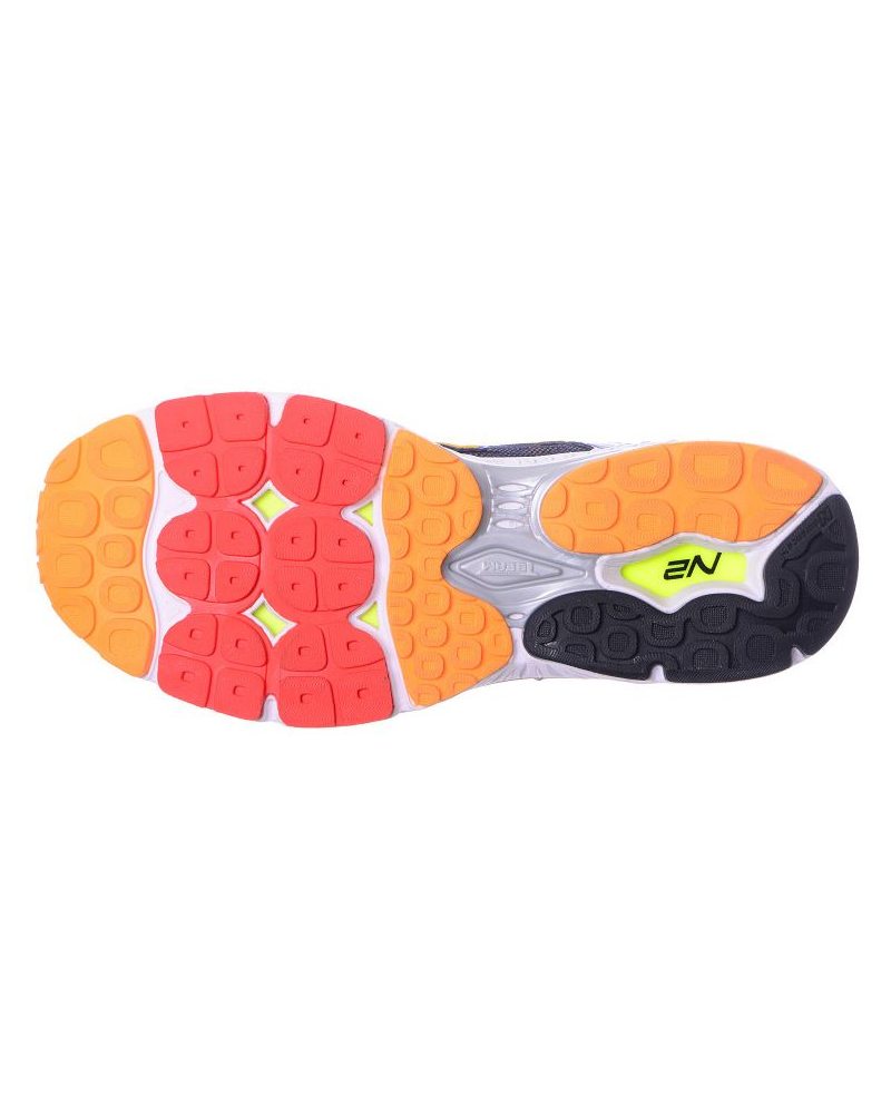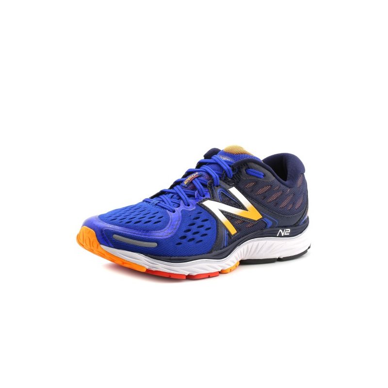 New Balance M 1260 V6 to wyjątkowo lekki but do biegania. Cholewka buta wykonana jest z bardzo lekkiej i przewiewnej niebieskiej siatki. Zapewni to świetną wentylację oraz odprowadzanie wilgoci z wnętrza buta. Tylna część buta jest dodatkowo wzmacniana. Logo firmy jest w kolorze pomarańczowym i srebrnym. Za stabilność stopy odpowiedzialne są niebieskie sznurówki z czarnym paskiem po środku. Elementem najbardziej ułatwiającym bieg jest wyposażona w liczne technologię podeszwa. Jest ona wyższa na pięcie dzięki powietrznej poduszce widocznej od spodu. Dodatkowo środkowa część stopy jest wzmacniana co zapobiega kontuzjom. Duża ilość bieżników ułatwia skrętność oraz przyczepność do podłoża. Mieszanka kolorów wykorzystana do zaprojektowania podeszwy dodaje butom dodatkowego designu.