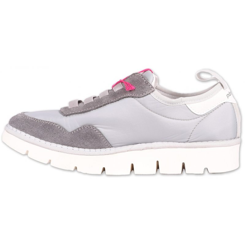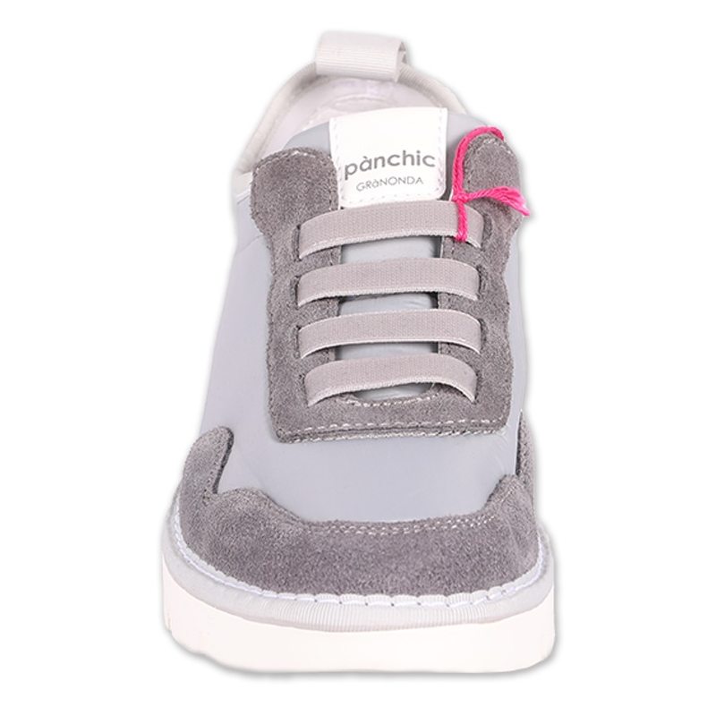 Sneakersy Panchic model Arianna to ultralekkie oddychające damskie trampki. Cholewka buta została wykonana z jasnoszarego śliskiego materiału syntetycznego i posiada ciemne materiałowe wstawki. Podeszwa została stworzona przy użyciu miałej gumy. W podeszwie znajdują się głębokie szpary co nadaję butom dodatkowego designu. Za stabilność stopy odpowiadają elastyczne pasy imitujące sznurówki oraz gumy przytwierdzone do języka wewnątrz buta.