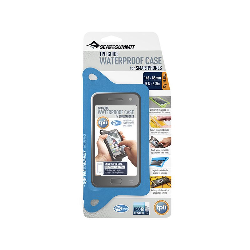 Pokrowiec na telefon Sea To Summit TPU Guide Waterproof wykonany został z lekkiego, termoplastycznego poliuretanu (TPU), który jest wytrzymały, w pełni plastyczny, odporny na promieniowanie UV i ekstremalnie niskie temperatury. Materiał ten w pełni przewodzi impulsy oraz ciepło z palca na ekran iPhona® i innych telefonów, dzięki czemu korzystanie z telefonu poprzez materiał TPU nie sprawia żadnych problemów. Potrójnie rolowane zamknięcie dodatkowo uszczelnione zamykaniem strunowym oraz podwójnym systemem rzepów zapewnia 100% wodoszczelność zajmując przy tym bardzo małą ilość miejsca. W górnym oraz dolnym rogu etui znajdują się otwory pozwalające przytroczyć pokrowiec praktycznie wszędzie.